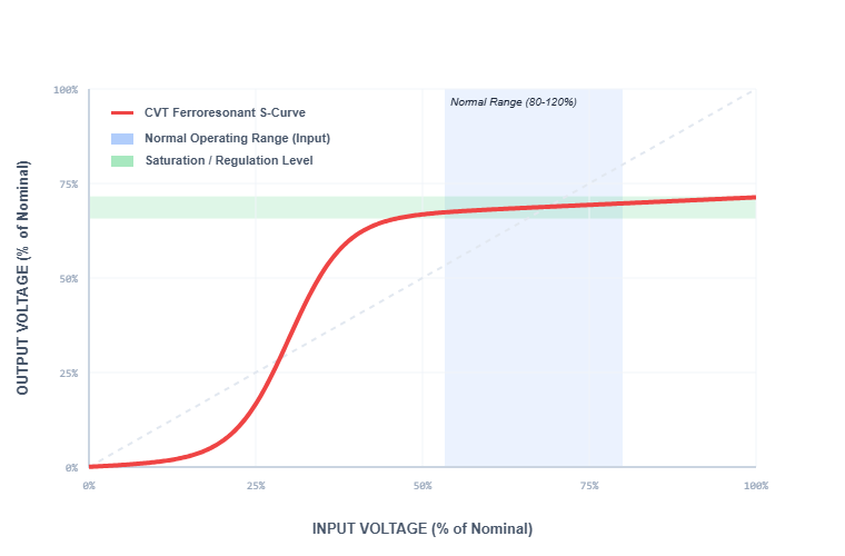 The CVT operates in the magnetic saturation region. When the iron core of a transformer is in saturation, relatively large changes in winding current results in very small changes in magnetic flux.