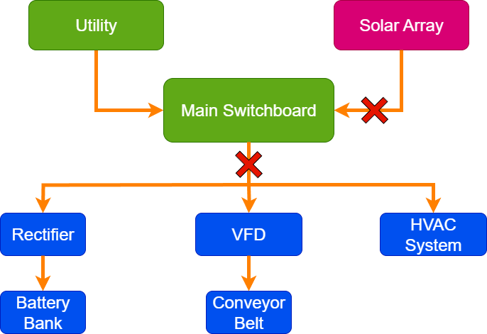 Supply from solar array and utility to power downstream loads at a manufacturing plant