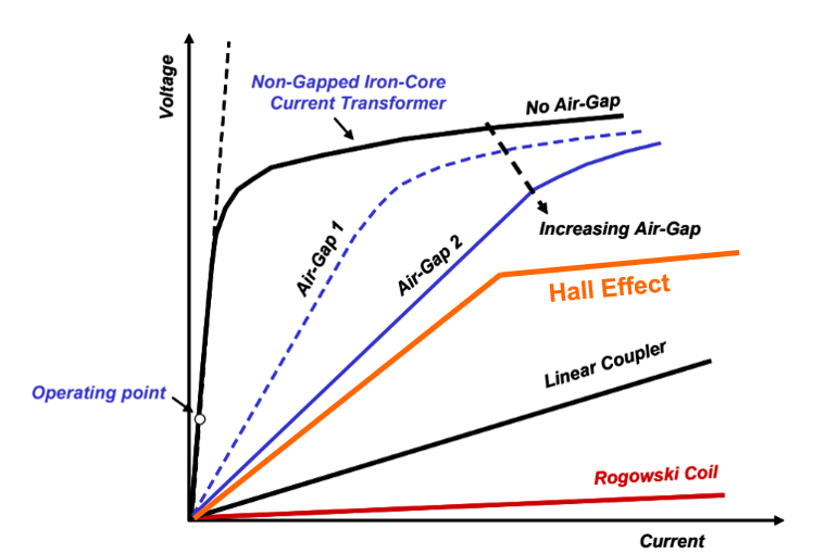 Rogowski coils remain linear with increasing current, but the voltages induced are low, leading to lower sensitivity.